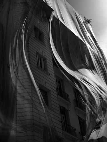 As linhas, os padrões e as estruturas das redes de contenção de edifícios em obras chamaram a atenção do fotógrafo Thales Leite, que passou a registrar esses prédios, criando imagens de alto contraste de esculturas barrocas monumentais. Com curadoria de Marcelo Campos, uma seleção de 20 fotos desta série de trabalhos compõe a exposição Véus. Todas as fotos são em p&b, sem pessoas, cores ou sinais que identifiquem os lugares.Véus faz uma referência à obra de Christo e Jeanne-Claude, pois, após a reforma dos edifícios, somente as fotografias restarão dessas efêmeras esculturas industriais.