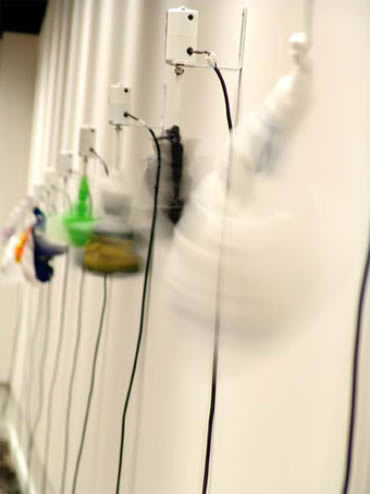 É o caso de Jungle Jam, instalação criada em 2006 para a exposição com o mesmo título, que ocorreu no FACT (Foundation for Art and Creative Technology), de Liverpool, na Inglaterra. A obra é composta por trinta motores idênticos, dispostos em linha horizontal sobre as paredes do espaço expositivo. Cada motor é conectado a um pino, e este a uma sacola. Quando ativados, os motores fazem girar os pinos e, com eles, as sacolas, que batem sobre as paredes e produzem sons.
