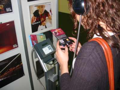 Balcão da ST2 Music, que produziu uma série de cartões com impressões em códigos de barras, junto a uma pequena tela disparada por um leitor em contato com o cartão específico de cada produto